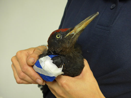Als der Anruf kam war in wenigen Sekunden die Entscheidung gefallen, dass der Schwarzspecht auch als Patient bei uns abgegeben werden durfte. Diese besonders geschützte Art ist eine nicht sehr häufig vorkommende Spechtart in Deutschland. Das liegt daran, dass er zusammenhängende ältere Waldbestände mit entsprechendem Totholzbestand zum Überleben benötigt. Er wurde uns von den Findern in einem Pampers-Pappkarton überreicht, welcher als kurzzeitiges Transportgefäß durchaus eine Möglichkeit war. Doch der Specht wollte sich schon auf dem Weg zu uns durch die dicke Pappe durchhämmern. Eine Box war für ihn bereitgestellt und er konnte schnell umgesetzt werden. Da wir die anstehende Röntgenuntersuchung selbst durchführen können, konnte ihm schnell geholfen werden.
